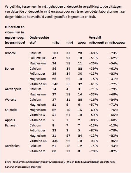 En wat er niet in de bodem zit, kan ook niet door planten worden opgenomen. Je merkt dit heel duidelijk in analyses van groenten. De verschillen zijn heel groot tussen vroeger en nu (zie tabel).